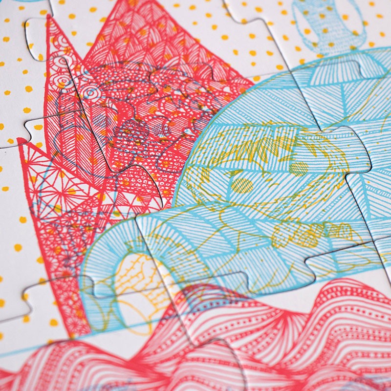 Inside the box, you'll find 4 puzzles of increasing difficulty - 9, 12, 16, and 20 pieces! Start easy, then step it up a notch! The set is complemented by two colored lenses (one red and one blue). Once the puzzle is assembled and looking through the lens, we will discover hidden characters and small surprises.