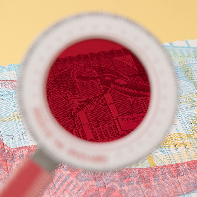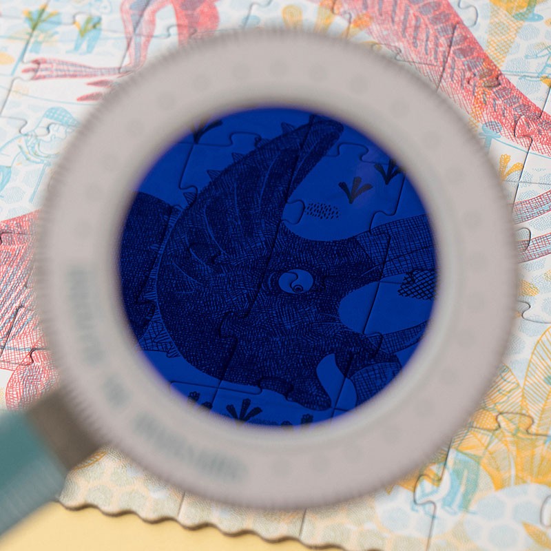 Embark on an astonishing journey with the Discover the Dinosaurs puzzle! Put together the 200-piece set featuring prehistoric pals such as T. Rex, the diplodocus, and a spinosaurus. With the included magic magnifying glasses, take your puzzle experience to the next level: Look through the blue lens to spot the dinos roaming around their habitat, and use the red lens to see them fossilized in the museum.