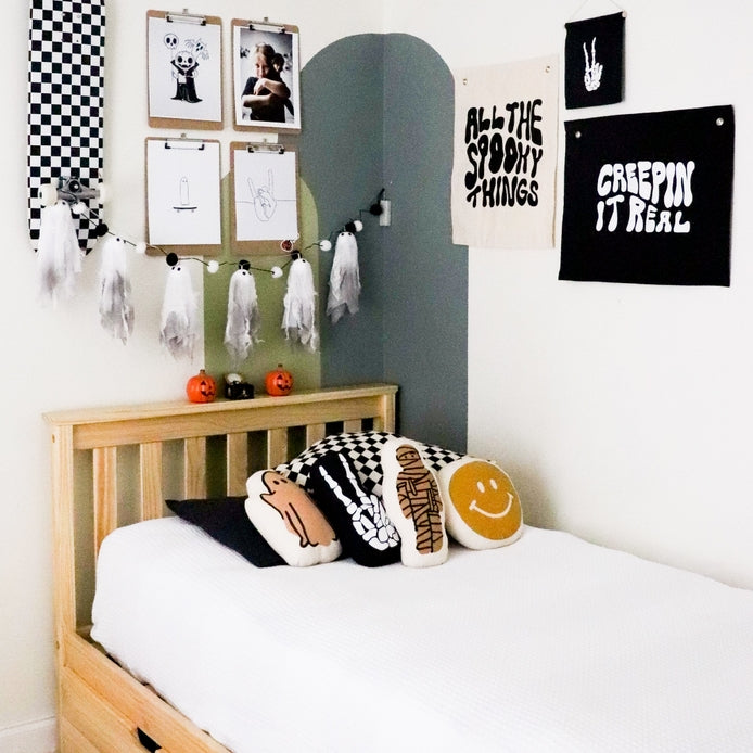 "Skeleton Peace" Hang Sign | Halloween Wall Flag. Sewn and screen printed by hand on black canvas by local artisans.