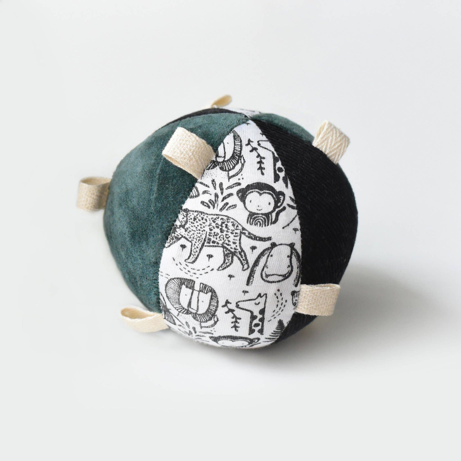 This sensory taggy ball has an organic cotton shell and is designed to delight your baby's developing senses. The high-contrast hand-painted graphics grab the baby's attention visually, while its textures and rattle provide tactile and auditory stimulation.